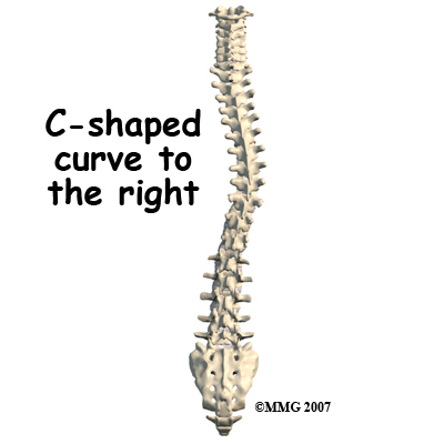 Any part of the spine can be affected by scoliosis, however, most often the thoracic and then lumbar spines are affected. The vertebrae curve to one side and may rotate, which makes the waist, hips, or shoulders appear uneven. At first, a C-shaped curve may develop causing the shoulders and hips to tilt down on one side. In an effort to keep the head in the middle, the spine may compensate by curving the lower part of the spine in the other direction, forming an S-curve.