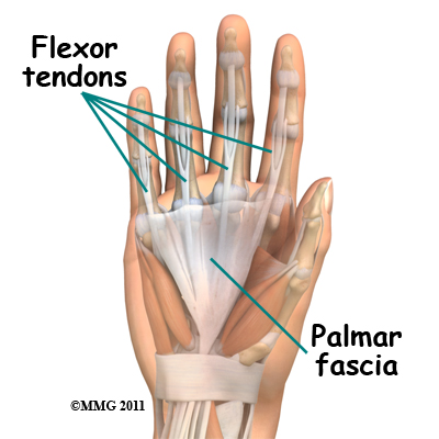 Lying just under the skin of the palm is the palmar fascia; a thin sheet of connective tissue shaped somewhat like a triangle. This fascia covers the tendons of the palm of the hand and holds them in place. It also prevents the fingers from bending too far backward when pressure is placed against them. The fascia separates into thin bands of tissue at the fingers. These bands continue into the fingers where they wrap around the joints and bones. Dupuytren's contracture forms when the palmar fascia tightens, causing the fingers to bend.
