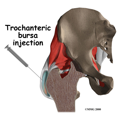 An injection of a local anesthetic into the bursa can also help your doctor diagnose trochanteric bursitis. If the injection removes the pain immediately, then the diagnosis is probably trochanteric bursitis. Most physicians will also add a bit of cortisone medication to the novocaine to help treat the condition at the same time. Cortisone is a powerful anti-inflammatory medication. It can reduce swelling and pain when injected directly into the bursa. The injection will probably not cure the problem. But it may control the symptoms for months.