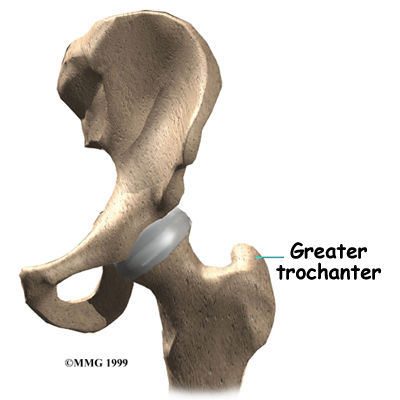 Stress fractures can also happen in the shaft of the femur bone, the greater trochanter, and the pelvis bone. The greater trochanter is a large bump below the neck of the femur. The buttock muscles that move the hip connect to this part of the femur.