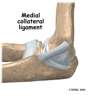 In the elbow, two of the most important ligaments are the medial collateral ligament and the lateral collateral ligament. The medial collateral is on the inside edge of the elbow, and the lateral collateral is on the outside edge. Together these two ligaments connect the humerus to the ulna and radius, and keep the bones tightly in place as they move around the end of the humerus. These ligaments are the main source of stability for the elbow but can be torn when there is an injury or dislocation to the elbow. If they do not heal correctly the elbow can be too loose, or unstable.