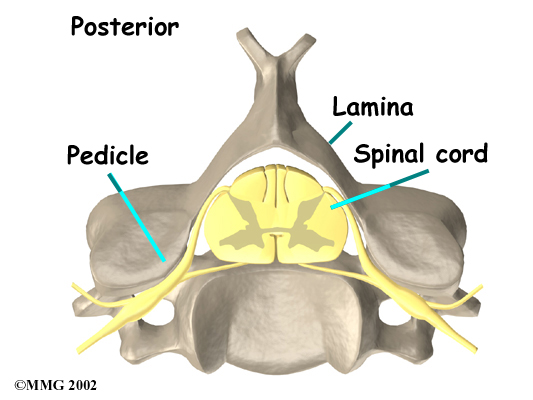urgeons perform this procedure through the back of the neck. This is known as the posterior neck region. It includes the parts that make up the bony ring around the spinal cord (the pedicles and laminae.)