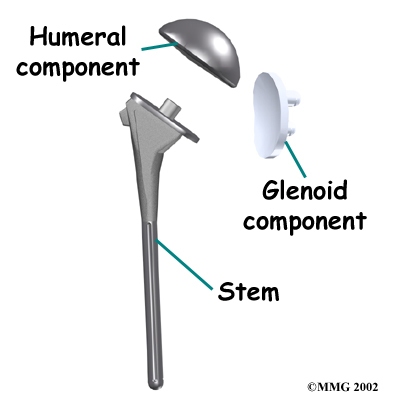 Each prosthesis (artificial joint) is made up of two parts. The humeral component replaces the humeral head, or the ball of the joint. The glenoid component replaces the socket of the shoulder, which is actually part of the scapula.