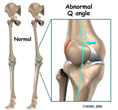 Another type of imbalance may exist due to differences in how the bones of the knee are shaped. These differences, or anatomic variations, are something people are born with. Some people are born with a greater than normal angle where the femur and the tibia (shinbone) come together at the knee joint. Women tend to have a greater angle here than men. The patella normally sits at the center of this angle within the femoral groove. When the quadriceps muscle contracts, the angle in the knee straightens, pushing the patella to the outside of the knee. In cases where this angle is increased, the patella tends to shift outward with greater pressure. This leads to a similar problem as that described above. As the patella slides through the groove, it shifts to the outside. This places more pressure on one side than the other, leading to damage to the underlying articular cartilage.