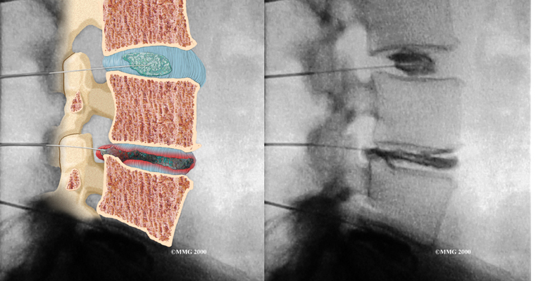 Doctors sometimes order a specialized X-ray test called discography. In this test, dye is injected into one or more discs. The dye is seen on X-ray and can give some information about the health of one or more discs. This test may be used when surgery is being considered to determine which disc is causing problems.