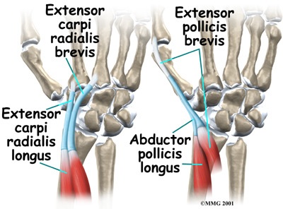Wrist extensor tendons work like the bow used by violin players. The wrist extensor tendons are like the bow, and the thumb muscles are like the strings. As the wrist curls down and in, the wrist tendons rub back and forth against the thumb muscles. The friction builds up, much like the effect of rubbing two sticks together. This can lead to irritation and inflammation of the tenosynovium covering the wrist extensor tendons.