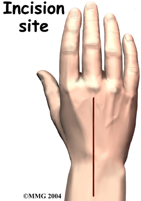through the skin on the back of the wrist. The tendons that run over the back of the wrist are then moved out of the way, and the surgeon cuts open the joint capsule that surrounds the wrist joint.