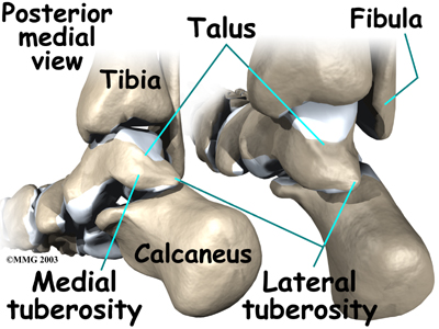 Two small bony bumps, called tuberosities, project from the back of the talus, one on the inside (medial) edge and one on the outer (lateral) edge.