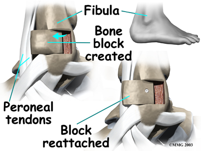 The surgeon slides the small block of bone backward, out of its original spot. The bone may be rotated slightly to create a solid barrier that will help keep the tendons from sliding around the lower edge of the fibula. A screw is inserted through the small block of bone into the fibula. The screw keeps the bony block in its new location until it heals.