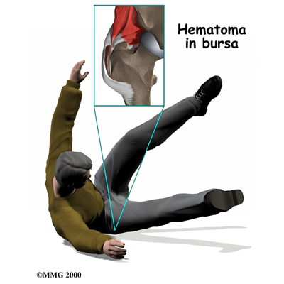 A fall on the hip can cause bleeding into the bursa, forming a hematoma. The bleeding is not serious, but the bursa may react to the blood by becoming inflamed. The inflammation causes the bursa to become thickened over time. This thickening, constant irritation, and inflammation may result in the condition becoming chronic, or long lasting.