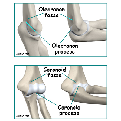 The upper end of the ulna (the bone on the inside of your arm) is shaped like a hook. When the elbow is straight the olecranon process (the tip of the hook) fits into a cavity in the back of the humerus (the olecranon fossa). When the elbow is fully bent the prominence on the front of the ulna (the coronoid process) fits into a cavity in the front of the humerus (the coronoid fossa). The joint surface of the ulna is shaped like the roof of a house and fits into a corresponding groove in the surface of the humerus (the troclear groove). This gives some side-to-side stability to the joint.