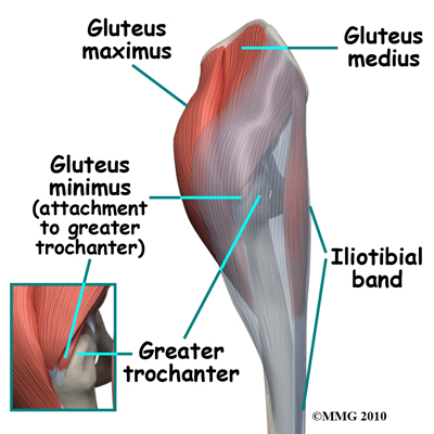 The gluteus maximus is the largest of three gluteal muscles of the buttocks. The gluteus maximus muscle spans the side of the hip and joins to the iliotibial band. The iliotibial band is a long tendon that passes over the bursa on the outside of the greater trochanter. It runs down the side of the thigh and attaches just below the outside edge of the knee. The other two buttocks muscles, the gluteus medius and the gluteus minimus, attach to the greater trochanter. These muscles are known as abductors because they function to pull the lower leg away from the body; a motion that is called abduction. These muscles can be torn where they attach to the greater trochanter causing pain and weakness as well as a snapping sensation. The acetabular labrum is a fibrous rim of cartilage around the hip socket that is important in normal function of the hip. It helps keep the head of the femur (thigh bone) inside the acetabulum (hip socket). It provides stability to the joint.