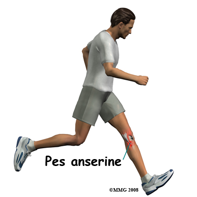 The patient often points to the pes anserine as the area of pain or tenderness. The pes anserine is located about two to three inches below the joint on the inside of the knee. This is referred to as the anterior knee or proximedia tibia. Proximedia is short for proximal and medial. This term refers to the front inside edge of the tibia.