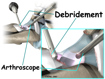To begin, two small incisions are made through the skin on each side of the impingement area. The surgeon inserts the arthroscope to see which area of the tendons or joint capsule are irritated and thickened. The arthroscope lets the doctor see if a meniscoid lesion (mentioned earlier) is present. A small shaver is used to clear away (debride) irritated tissue from the affected ligaments. The surgeon also debrides the tissue forming a meniscoid lesion and any areas of the joint capsule that are inflamed. Small forceps may also be used to clear away irritated or inflamed tissue.